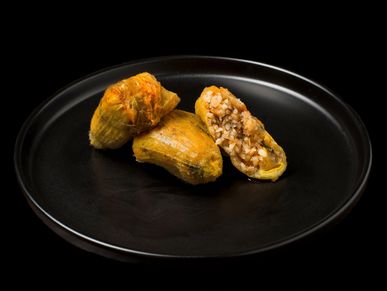 Κολοκυθολούλουδα ή ανθοί κολοκυθιού γεμιστοί με ρύζι και φρέσκα μυρωδικά. Ψημένοι σε φούρνο.