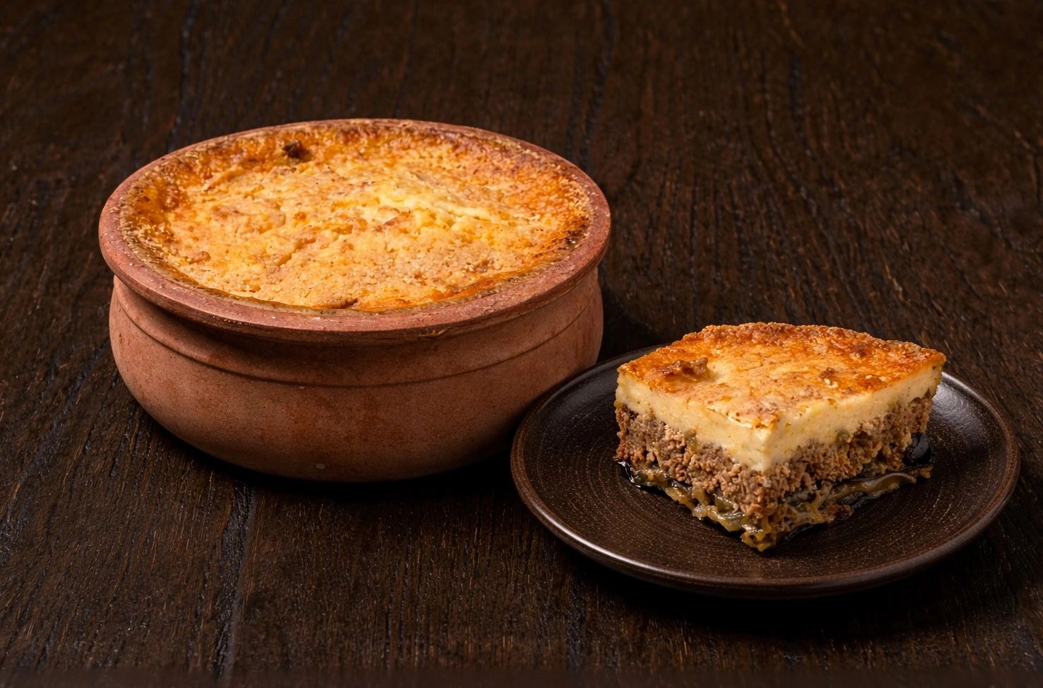 ΣΥΣΤΑΤΙΚΑ: Μπεσαμέλ, μελιτζάνες, πατάτες, χοιρινός και μοσχαρίσιος κιμάς.